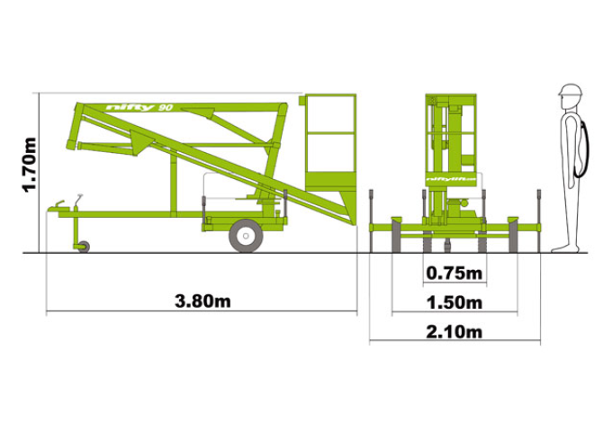 NIFTY 90 отличается простотой управления и легкостью транспортировки благодаря своим компактным размерам и малому весу. Он оснащен надежной электрогидравлической системой подъема, которая обеспечивает плавное и стабильное движение. Грузоподъемность до 120 кг позволяет безопасно работать с необходимыми инструментами и материалами. Высокая маневренность и способность работать в узких проходах делают его идеальным выбором для использования как внутри помещений, так и на открытых площадках. Этот подъемник — надежное решение для профессионалов, требующих эффективности и безопасности на высоте.